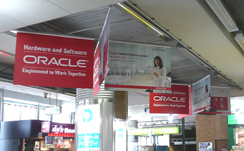 フラッグ広告は、駅構内の天井から吊るして掲出するフラッグ型の広告です。通路・コンコースの天井部に掲出するケースが多く、駅利用者の頭上で優れた視認性を発揮します。「臨時ポスター集中貼り」と併用することで、駅を丸ごとジャックするような大々的な広告展開も可能です。