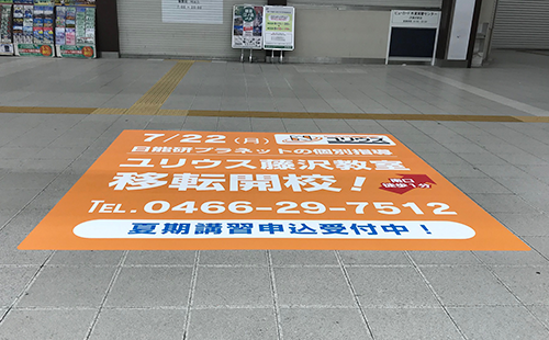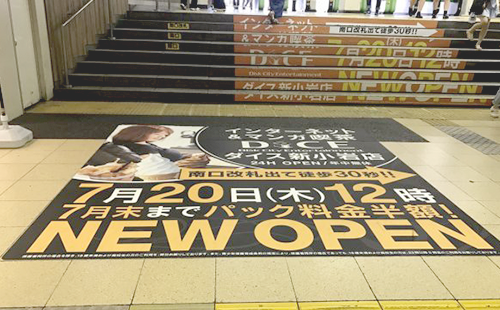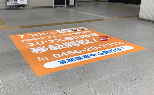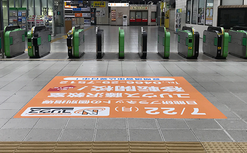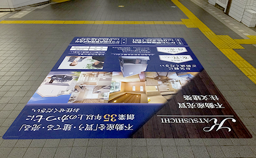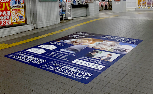 フロア広告は、駅構内のフロア上に掲出する広告で、自由通路やコンコース、改札周辺に掲出するケースが多いです。駅利用者が歩いていると突如床面に広告が現れるため、意外性を伴ったインパクトを残すことができます。一般的には、3メートル四方のシート型で掲出しますが、掲出できるサイズ・形などは電鉄・駅などによって変わってきます。