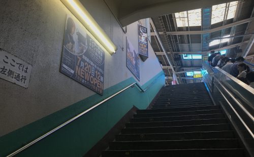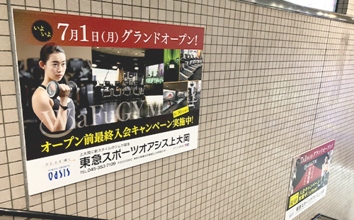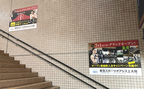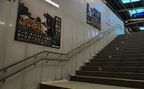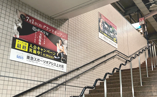 臨時ポスター集中貼りは、一つの駅構内に複数枚のポスターを集中的に掲出する広告です。基本的に、通常は広告を掲出しない階段壁面などの随所に複数のポスターを掲出するため、大きなインパクトを与えることができます。なお、JR交通広告認知度調査によると、「広告注目率 48.1%」「広告到達率 54.9%」と、いずれも他の駅広告に比べて高い数値が出ています。